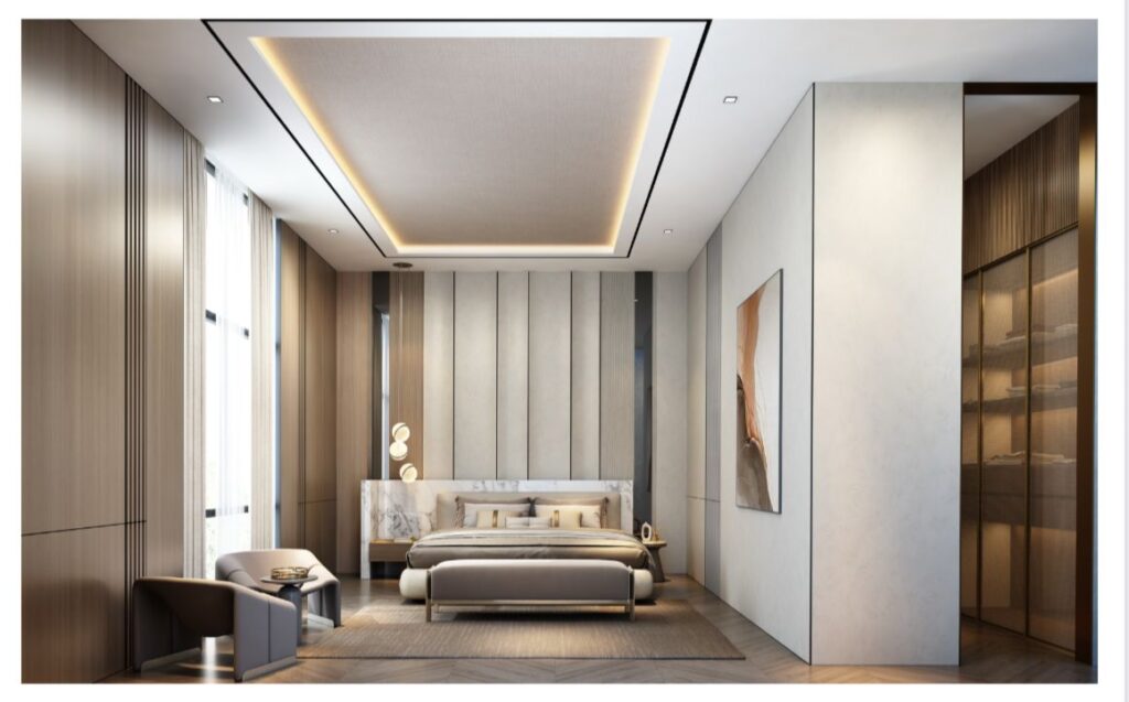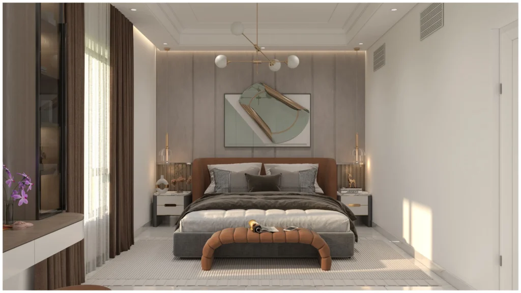 A serene bedroom interior designed for comfort and calm. Soft textures, balanced tones, and refined details come together to create a space that feels warm, inviting, and effortlessly elegant.